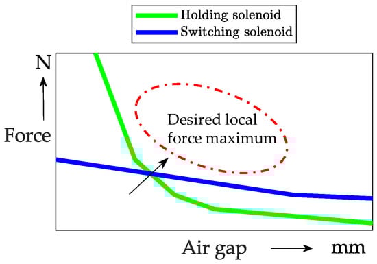 Region of desired local force maximum in relation to characteristic curves of holding and switching solenoids.