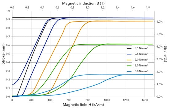 Most commonly, NiMnGa alloys with a maximum strain of 6% for stresses up to 2.0 N/mm2 and a blocking stress of around 3.5 N/mm2 are investigated [6]. In combination with their high energy density, these alloys offer potential for application in compact actuators. To achieve desired elongations, magnetic excitation needs to be sufficient. Figure 4 shows the field strain characteristic in relation to mechanical load, as given by the manufacturer. The material’s ability to reach full or near-full elongation at loads up to 2.0 N/mm2 for flux densities of 0.6 … 1.0 T within the alloy can be seen.