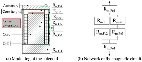 Modelling of a simplified solenoid with elongated inner core and corresponding magnetic circuit. The labels indicate a correlating magnetic resistance Rm for ferromagnetic parts, e.g., Rm,Fe4, or for the air gap, e.g., Rm,a1. According to their length, cross-sectional area and material, these magnetic resistances can be determined approximately [10].