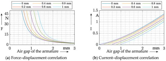 Thus, with an active stroke of the core, it can be assumed that the rise of the force–displacement characteristic shifts toward a larger air gap due to the actively shortened air gap (see Figure 6a). Furthermore, it is apparent that the current–displacement characteristic also shows a beneficial influence of the enabled core extension, as can be seen in Figure 6b. The switching current required for an explicit air gap decreases with the amount of core extension.
