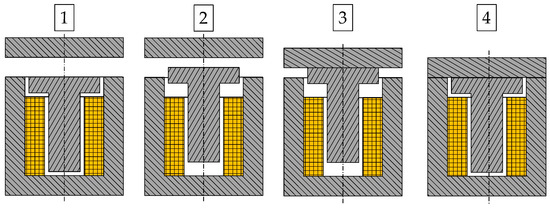 The basic principle of both actuators shown in this article is illustrated in Figure 7. The design shown in this sequence does not contain any MSM sticks since the basic switching operation of a switching/holding solenoid with active core is independent from the actual physical principle driving its extension. In [4], the movement of the core is enabled due to reluctance force, for example. In this paper, however, MSM elements were at the center of investigations and were used to drive the plunger in its front-end position. It was further investigated whether a horizontal and/or vertical orientation of the MSM element is advantageous. Therefore, only the basic principle of the active core with its extension is emphasized in Figure 7, without already specifying a favorable orientation in the shown principle of a switching operation.