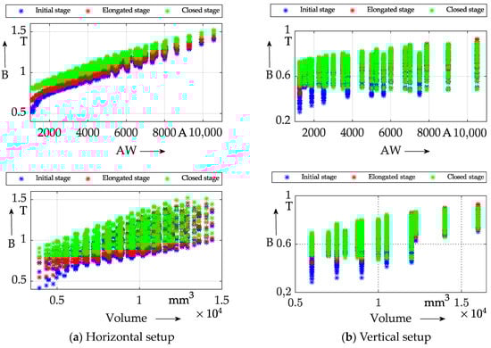 Simulation results: correlation flux density (B) and excitation (AW), and correlation flux density (B) and actuator volume (mm3), for both horizontal (a) and vertical (b) setups.