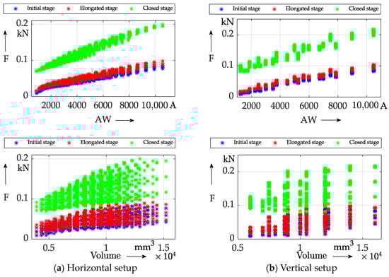 Differences between the figures were less distinct than for the flux density results. For both setups, excitation was dominant for determining actuator force. However, actuator volume appeared to have a stronger influence on actuator force for the horizontal setup over the whole of the volume range. For the vertical setup, there was a visible increase until about 1800 mm³. After that point, maximum force changed only marginally if at all, while minimum force still increased. Overall, force ranges were similar between the two setups. However, the horizontal setup showed a slowed rate of increase with excitation over around 1500 AW, similar to that found for the magnetic flux density, as is visible in Figure 9a. This was attributed to the same saturation effect in the MSM stick as mentioned above. In combination, this indicated a more efficient use of the horizontal setup for lower excitation and therefore potentially more miniaturized actuator systems.