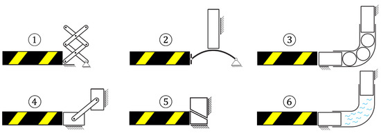 Translation of the MSM stick’s elongation from a horizontal to a vertical movement. Lifting platform (①), Flexure (②), Bent tube with balls (③), Sliding joint (④), Inclined plane (⑤), Bent tube with fluid (⑥).