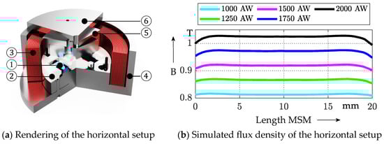 Despite the saturation in many of the evaluated variants, flux densities were significantly higher for the horizontal setup at comparable actuator volume. This was further indication of the simpler setup of the magnetic circuit for the horizontal setup and suggested more potential for miniaturization.