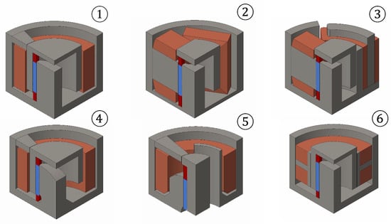 The challenge for this setup was to provide the required flux density in the sticks, since the magnetic field of the coil has to be tilted by 90°. For the best possible realization of this task, a design study with six different concepts dealing with the magnetic circuit design was investigated prior to the actual designing process. This step was necessary since the initial simulation results showed that achieving magnetic flux density in the MSM sticks was problematic. Figure 14 shows the different concepts, which were compared by FEA simulation. The red bars in the concepts in Figure 14 are mechanical transmission elements that are non-ferromagnetic, and the MSM sticks are displayed in blue.
