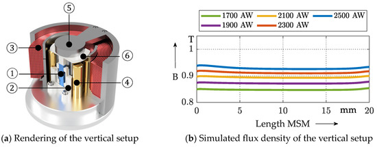 Design rendering and flux density over MSM stick length of the vertical setup. The section of (a) shows one of two integrated MSM sticks (①) in blue, which is integrated in a spring joint (②), shown in white. Together, the assembly is centered inside of the coil (③). The assembly, guided by four brass cylinders (④), can actively lift the plunger (⑤) in the axis of rotation by passing the strain of the MSM sticks to the operator (⑥) made of aluminum and thus to the ferromagnetic plunger.