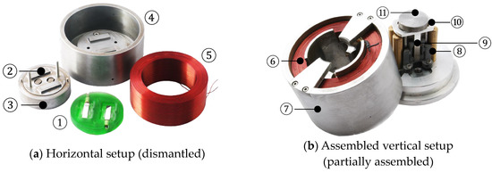 Built prototypes. In (a), the mounting of the two MSM sticks for the horizontal setup (①) is shown in green. Both MSM sticks as well as the balls used for transmission are embedded in this mounting. The upper part of the inner flux guide (②), the plunger (③), as well as the solenoid body (④) and the coil (⑤), are shown. (b) shows the vertical setup of the prototype. The coil (⑥) is integrated in the solenoid body (⑦) and the brass cylinders (⑧) provide guidance for the inner assembly consisting of the MSM sticks (⑨), the operator (⑩) and the plunger (⑪).