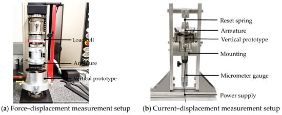 The machine shown in (a) is equipped with a load cell and carries the armature at the lower end of the crosshead. The armature is moved quasi-statically on the respective prototypes (shown here for the vertical setup) when the coil is energized by controlled current and the applied force is measured. (b) shows the setup for a dynamic measurement where the armature is not dependent on the movement of a crosshead. The armature is spring-mounted and the air gap between armature and actuator can be realized by raising or lowering the actuator through the micrometer gauge. Shown is an example of the test for the vertical prototype. The current required to attract the armature with a variable air gap is measured.