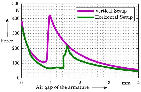 Furthermore, it was observed in [1] that the compression of the MSM sticks in the presence of a magnetic field by an energized coil leads to an additional reduction in the force on the armature. Thus, a force of up to 180 N can be absorbed by the two MSM sticks for the vertical setup under the given general conditions of the measurement, but this does not fully explain the reduction in the force by approx. 300 N as observed in Figure 18. The above-described course of the magnetic flux with the corresponding observable force direction, according to [10], has a great influence. For instance, an equivalent force–displacement characteristic could be observed in [4], whereas the use of MSM sticks in the developed solenoid was completely excluded. It remains to be stated at this point that the lowering of the force is suspected to be due to several mutually influencing factors.