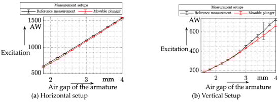 For the current–air gap characteristic, a hypothesis was also derived from the results of the Matlab/Simulink model in Figure 6. Thus, with a suitable design of the magnetic circuit, the characteristic curve should be shifted to the right due to the active stroke that has occurred because of the elongation of the MSM sticks. Attraction of the armature can occur at a smaller current due to the reduced air gap. For the measurement, a digital oscilloscope (oscilloscope: Rohde&Schwarz RTM3K-24M; www.rohde-schwarz.com)) and current clamp (current clamp: Fluke i30s; www.fluke.com (accessed on 14 August 2023)) were used to observe the switching process while gradually changing the air gap of the armature. A precision micrometer (precision micrometer: Hartig 3585 S2 0-60; www.hartig-germany.com (accessed on 14 August 2023)) was used to change the air gap from 4 mm to the closed state, and the current required for a switching operation was noted for five measurements per state. This procedure was carried out for the real actuator and a comparison setup. In the comparison setup, the vertical and horizontal setups were changed so that the active stroke was no longer passed on to the plunger by the MSM stick elongation. In the vertical setup, the aluminum spacer was removed, and in the horizontal setup, the force redirection balls were removed. However, the magnetic circuit remained identical to the original setup in both comparative setups.