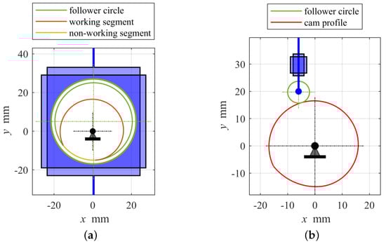 The traditional design of the cam mechanism is often focused on the motion law of the follower [,]. Starting from the motion law, the method of using differential geometry and other methods to analytically solve the cam profile are relatively mature []. For applications that only require specific movements such as push, return, far rest, and near rest, this method can effectively solve most problems []. However, in the EMB, because the input motion is arbitrary, the output motion pattern is not the most-direct design goal, and simply ensuring whether there is an impact is not enough [,]. The cam mechanism in the EMB acts as a transmission mechanism, having other design goals we need to care about []. The traditional design of the cam mechanism is often focused on the motion law of the follower [,]. Starting from the motion law, the method of using differential geometry and other methods to analytically solve the cam profile are relatively mature []. For applications that only require specific movements such as push, return, far rest, and near rest, this method can effectively solve most problems []. However, in the EMB, because the input motion is arbitrary, the output motion pattern is not the most-direct design goal, and simply ensuring whether there is an impact is not enough [,]. The cam mechanism in the EMB acts as a transmission mechanism, having other design goals we need to care about [].