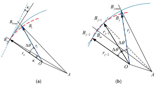 The operation of the EMB is clamping to different clamping force or loosening, which is different from the common cam working process. This requires the cam to swing to a different angle rather than rotate continuously. Therefore, the cam profile in the EMB will not be used for a complete cycle. The design in this paper mainly focuses on the working segment profile. The working segment profile means that the profile can be tangent to the driven bearing in the normal working process. The profile not tangent to the driven bearing becomes the non-working segment. Determining the non-working segment is essentially a boundary constraint for the working segment. In order to enhance the strength of the camshaft as much as possible and not interfere with other parts, we selected the arc section with the same inner diameter of the driven bearing as the non-working segment. The initial position of cam rotation is the most easily interfered position. As shown in Figure 6, blue represents the driven bearing inner ring, and red represents the polar radius of the initial and final positions.