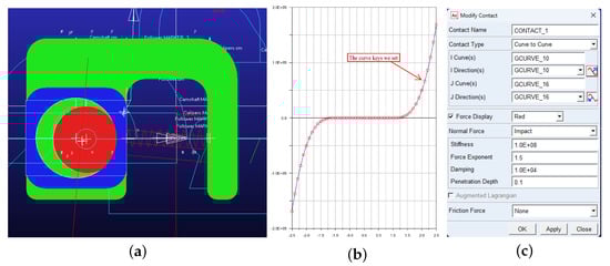 A nonlinear spring is set between the driven bracket and the caliper to simulate the caliper defined in Section 3.1, as shown in Figure 14b. Input a constant speed rotation of 1°/s on the camshaft to achieve the EMB action. The contact between the cam and the driven bracket is the most-core relationship in the cam simulation process. This article selected the impact contact model, and the parameters are defined as the contact parameters between steel and steel, as shown in Figure 14c.