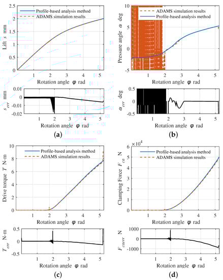 Comparison of the results between the profile-based analysis method and the ADAMS model. (a) The cam lift and its error; (b) the pressure angle and its error; (c) the drive torque and its error; (d) the clamping force and its error.