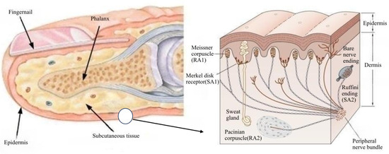 The subcutaneous tissue is a complex system in which different tactile receptors are distributed. Four types of receptors are important for tactile perception of the fingertip: Meissner vesicles, which perceive edges; Merkel vesicles, which perceive mechanical pressure and low-frequency vibrations caused by shape and texture; Pacinian vesicles, which perceive high-frequency vibratory stimuli; and Ruffini vesicles, which perceive elasticity, are distributed in the finger in the subcutaneous soft tissue.