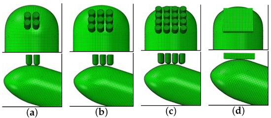 The fingertip forms an inclination angle of 20° with the horizontal plane, and the displacement of the rigid indenter is perpendicular to its axis. The end face of the distal finger end model is fixedly constrained to simulate the process of compression of the finger belly, and the squeezing pressure, pressure distribution of contact, stress and strain within the soft tissue, and squeezing deformation are set as the output quantities of the simulation. The numerical simulations are carried out for four dot arrays, respectively, as shown in Figure 3. That is, a 2 × 2 dot matrix, 3 × 3 dot matrix, 4 × 4 dot matrix, and flat plate with a single cylinder of 2 mm diameter.