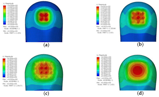 The displacement cloud of each indenter squeezing finger belly: (a) dot matrix; (b) dot matrix; (c) dot matrix; (d) flat plate.