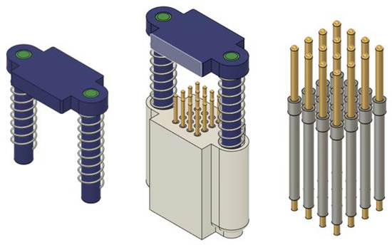 The tactile feedback module mainly consists of a telescopic platen and a stylus mounted on the base, as shown in Figure 5. The support rod of the telescopic pressure plate and the mounting holes on the base are clearance fits, and they are supported by springs on both sides. The spring pins are mounted on the base in a arrangement according to the best results obtained from the finite element experiments, with a transition fit to the mounting holes in the base and a spacing of 2.5 mm. This is within the perceptual threshold of the human fingertip skin to provide the largest possible contact surface to increase the tactile perception effect of the finger. The distance between the highest point of the spring pin set and the bottom surface of the telescopic pressure plate is the average height of the index finger to ensure the freedom of movement of the index fingertip. The top of the telescopic platen is provided with two drive rope catch blocks to form a connection between the drive rope and the telescopic platen.