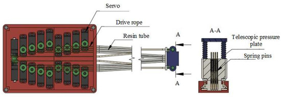 The height adjustment of the spring stylus is controlled by the servo, which is obtained by precise reciprocating rotation of the servo between 0 and 90°. The drive train model of a single spring stylus is shown in Figure 7. However, the transmission system and resin tube elasticity can produce errors in the displacement of the stylus. Therefore, the authors performed a detailed force analysis of the system and suppressed the system errors to ensure the accuracy of the servo motor output displacements. The default system is frictionless and the drive rope has a very low mass and no deformation.