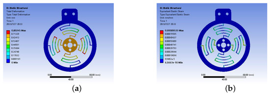 The elbow joint of the exoskeleton uses a flexible joint whose elastic structure is symmetrically distributed to compensate for the axis deviation between the elbow joint and the exoskeleton during flexion and extension, which has three degrees of freedom in the plane and is connected to the transition joint through a connecting shaft and bearing, taking a passive adjustment for a more compact structure. The flexible module is calibrated by finite element software to verify the performance of its structure. The magnitude of the force applied in both the X and Y directions was 30 N [39], and when the flexible module is subjected to a force in the X direction, displacement and strain are generated, and its displacement in the X direction is 2.3198 mm and the maximum strain value is 0.002617, as shown in Figure 10. When the flexible module is subjected to a force in the Y direction, its displacement in the Y direction is 0.80245 mm and the maximum strain value is 0.00089533, as shown in Figure 11. The maximum displacement of the flexible module in both the X and Y directions is 2.3 mm, which can passively compensate for the axis deviation generated by the mechanical joint and the elbow joint of the arm to a certain extent, and the maximum strain values in the X and Y directions are in the safe range.