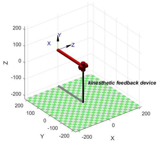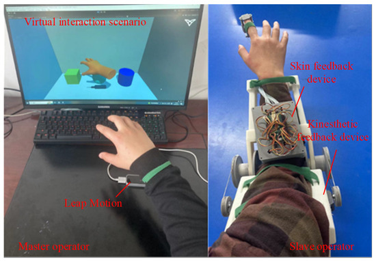 Based on the operation scenario of the PC, Leap Motion motion capture device, and kinesthetic–tactile feedback device, as shown in Figure 15, this experiment simulated the process of a blind person’s demonstration and teaching, in which the master operator (normal person) wore the kinesthetic gesture capture structure on the forearm, and the hand was located on the top of the Leap Motion motion capture device and manipulated the virtual hand to carry out the virtual interaction. The slave operator (blind person) wore a kinesthetic feedback device and a tactile feedback device on the arm and the tip of the index finger, respectively, and realized the positioning of the arm through the synchronized control of the kinesthetic feedback device, and then transmitted the tactile sensation to the blind person through the tactile feedback device.