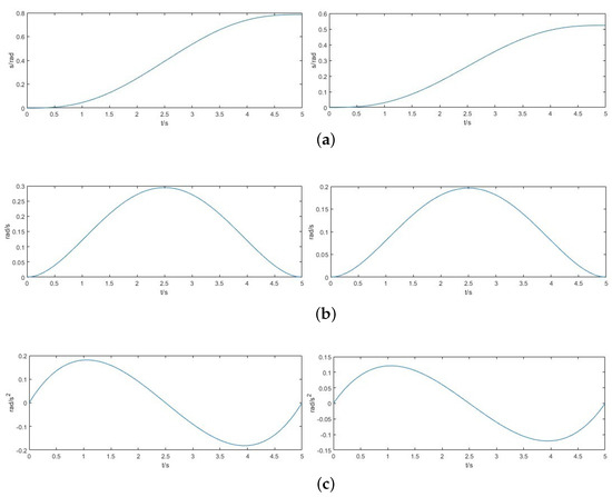 Angular displacement, angular velocity, and angular acceleration graphs. (a) Angular displacement curve; (b) angular velocity curve; (c) angular acceleration curve.