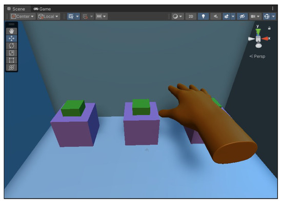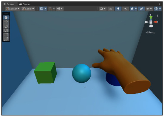 The virtual object shape perception experiment evaluated the extent to which a kinesthetic–tactile fusion feedback system can render the surface of 3D objects (cubes, spheres, and cylinders). The virtual interaction scenario is shown in Figure 16. During the task, the Leap Motion was placed on a table in front of the master operator. The slave participant was asked to perform the perception of haptic feedback. The master operator took approximately 4 s to touch the specified target with the Leap Motion-controlled virtual hand during the target touch task, thus allowing 10 s to touch each object and at least 10 s for the slave participant to perform shape perception recognition. A total of 10 touches were performed for each type of virtual object.