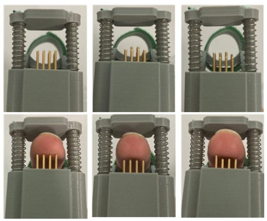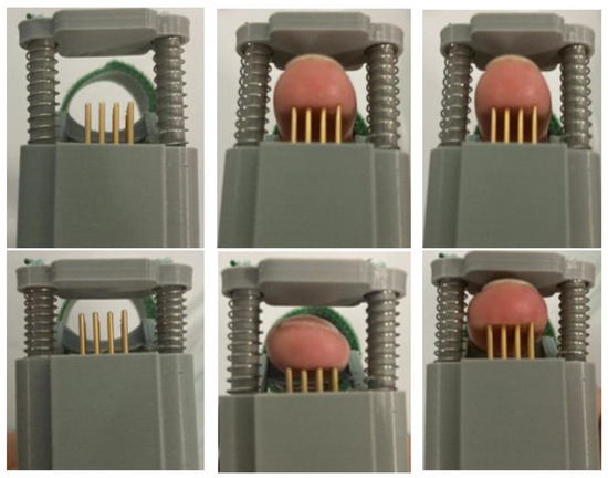 Figure 20 shows the contact diagram between the fingertip and the tactile feedback module. The first column shows the initial state of the tactile feedback module, which can reveal the squeezing stroke of the telescopic platen; the second column shows that when there is no force sensory feedback, the fingertip judges the elasticity of the virtual object by sensing the displacement of the stylus of the tactile display module; and the third column shows that when there is force sensory feedback, the fingertip judges the elasticity of the virtual object by combining the displacement of the stylus of the tactile display module and the squeezing pressure prompt of the telescopic platen.
