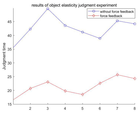 From the experimental data in the table above, it can be seen that the time to judge the elastic size of the three cubes varies between individuals. Using the comparative analysis method, by analyzing the comparison between the judgment time with and without force feedback, it was found that the judgment time of the elastic size of the three cubes was improved by at least 41.9% with the contact force provided by the force-feedback platen. The force feedback can improve the operator’s perceptual sensitivity.