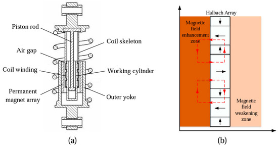 The electromagnetic semi-active suspension used in this paper is based on a cylindrical damper structure, with the addition of an electromagnetic linear actuator. The electromagnetic linear actuator is embedded in the suspension damper, as shown in Figure 1a [12]. The permanent magnet of the electromagnetic actuator adopts the Halbach array structure [13,14], which can effectively improve the electromagnetic characteristics of the device, as shown in Figure 1b. The left side of the Halbeck array is the area where the field is enhanced, which is also the area where the coil is active, which can generate a greater induced current, and on the right side is the area where the field is weakened.