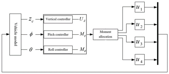 Given the interference between the control forces of the four suspensions on the vehicle body during actual driving, and the intertwined control objectives during the control process, direct adjustments to the control forces of the four suspensions may not yield significant control effects. Therefore, this paper first designs three fuzzy controllers to suppress the vibration of the liquid tanker truck body in the vertical, pitch, and roll directions, respectively. Subsequently, the requisite control forces and moments of the fuzzy controllers are equivalently calculated and allocated as the damping forces for the four electromagnetic semi-active suspensions. Finally, these suspensions feed the corresponding damping forces into the vehicle model, enabling comprehensive control of the vehicle’s motion. The principle of this control strategy is shown in Figure 3.