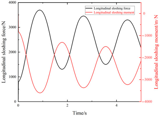 This paper aims to study the characteristics of liquid sloshing in the liquid tanker truck during driving, where the filling ratio is an important factor affecting the liquid sloshing. A tank with a filling ratio of 60% was selected for the study, as it demonstrates the dynamics of liquid sloshing and is a more common configuration in actual transportation. The tank body of the liquid tanker truck was modeled in Fluent and features an elliptical cross-section, with a major axis of 1 m, a minor axis of 0.8 m, and a length of 6 m. The liquid sloshing under the same longitudinal excitation with different filling ratios was simulated. The tank body with a filling ratio of 60% was selected to simulate the lateral excitation of the liquid tanker truck during turning, and the simulation time was 5 s. The longitudinal sloshing force and moment of the tank body over time were obtained, and the simulation results are shown in Figure 4.