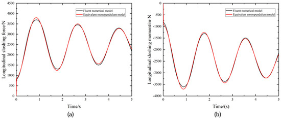 Comparison between the equivalent pendulum model and the Fluent numerical model for the longitudinal sloshing force (a) and the longitudinal sloshing moment (b).