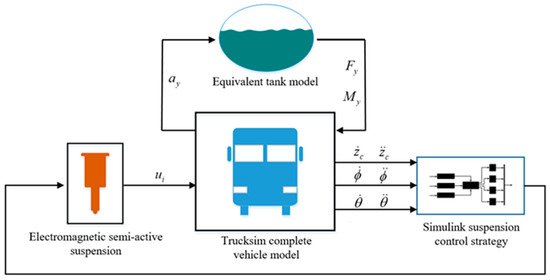 This paper aims to solve the problem of liquid tank vehicles being prone to rollover during transportation due to liquid sloshing in the tank. To this end, the proposed solution is to use electromagnetic semi-active suspension to reduce vehicle body sway. By analyzing the characteristics of liquid sloshing in the tank, a TruckSim vehicle model and a single-pendulum equivalent model for simulating liquid sloshing are established. An electromagnetic semi-active suspension control strategy is developed, and variables are set to connect the two software models. A TruckSim–Simulink co-simulation model is constructed with the goal of improving the stability of the liquid tanker truck. Moreover, simulation studies of the electromagnetic semi-active suspension control technology are conducted. The following conclusions are mainly obtained through the above research: