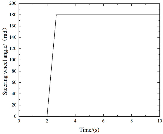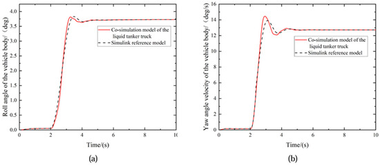 To verify whether the TruckSim–Simulink co-simulation model established in this paper can accurately portray the vehicle’s dynamic characteristics, we opted for a step input test as a means of model validation. In compliance with the regulations of the GB/T 12534 Road Vehicle Test Method General Rules, we conducted a step input test for the steering wheel angle. The vehicle speed was set at 60 km/h, the steering wheel angle was adjusted to 180°, the road adhesion coefficient was set at 0.8, and the duration was fixed at 10 s. The resulting steering-wheel-angle step input curve is illustrated in Figure 9. For ease of analysis, a seven degree of freedom vehicle model was established in Simulink as a reference model for conducting the same steering-wheel-angle step input simulation test. The roll angle and yaw angle of the liquid tanker truck obtained from the co-simulation model were compared with those of the reference model, as shown in Figure 10.