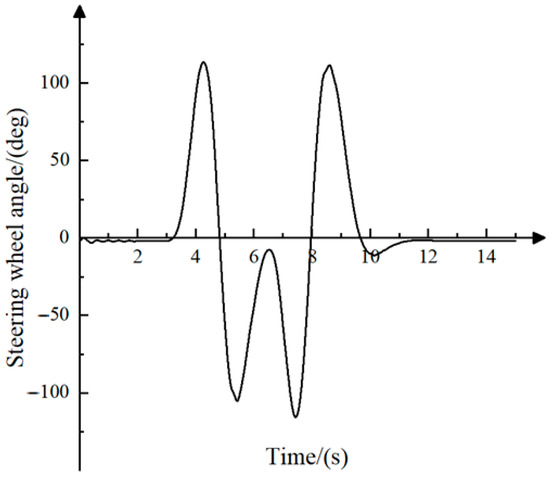 To verify the feasibility of using electromagnetic semi-active suspension to control the stability of the liquid tanker truck, this paper implements the double lane change test condition. The input steering wheel angle is shown in Figure 11, where the vehicle speed is set to 60 km/h, and the road adhesion coefficient is 0.85. The simulation results of the vertical vibration acceleration, pitch angle acceleration, and roll angle acceleration of the liquid tanker truck body are comparatively analyzed between the passive suspension system and the electromagnetic semi-active suspension control system.