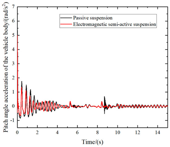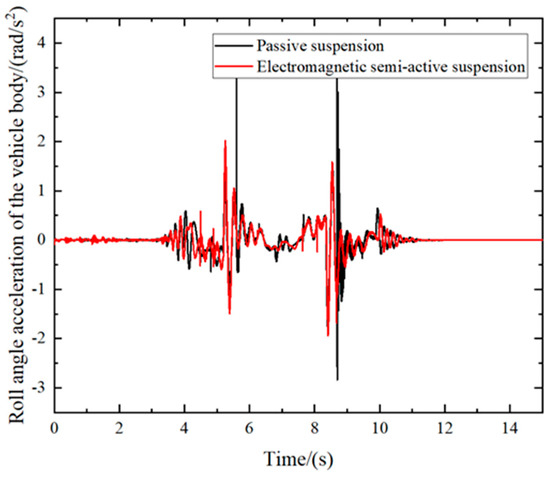 The curves of the vertical vibration acceleration and pitch angle acceleration of the liquid tanker truck body are shown in Figure 12 and Figure 13. They show that the vertical vibration and pitch of the body change sharply from 0 to 4 s, indicating that the startup acceleration condition of the liquid tanker truck has a significant effect on the vertical vibration and pitch of the body. Figure 14 shows that the startup acceleration of the liquid tanker truck has little effect on the roll angle, but the roll angle of the body starts to change sharply when the liquid tanker truck changes lanes at 3 s. By comparing the root-mean-square values in Table 2, it can be concluded that the liquid tanker truck controlled by the electromagnetic semi-active suspension has significantly improved vibration performance in the vertical, pitch, and roll directions of the vehicle body. The roll angle exhibited a remarkable performance improvement of 27.86%, highlighting the significant impact of the electromagnetic energy-fed suspension in suppressing the roll angle of the liquid tanker truck.