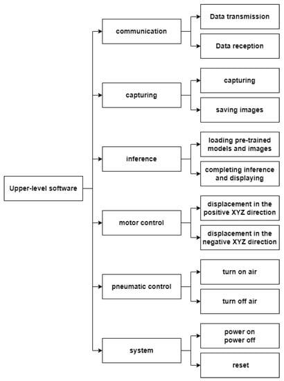 This paper’s control system consists of six subsystems: communication, capture, inference, electrical control, pneumatic control, and system. The framework diagram is shown in Figure 2.