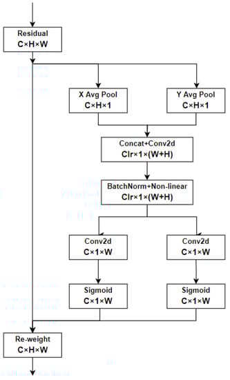 In the equation, [·,·] represents the concatenation operation along the spatial dimension, δ is a non-linear activation function, and f refers to the intermediate feature map obtained from spatial information in the horizontal and vertical directions. The feature map f is split into two separate tensors,  and , along the spatial dimension. These tensors are then transformed to have the same number of channels as the input tensor X using two 1 × 1 convolutions, denoted as  and , as shown in the following equation: