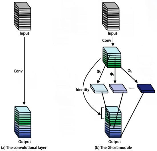 Given the input feature map  and output feature map , with a convolutional kernel f of size k × k, the convolutional computation  is performed. Here, C, H, and W represent the channel number, height, and width of the input feature map, while n, h, and w represent the channel number, height, and width of the output feature map. Linear operations are applied to each original feature map to generate s feature maps, as follows: