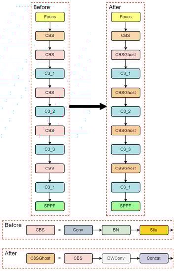 In this paper, all three CBS (Convolution-BatchNorm-SiLU) structures in the YOLOv5 architecture are replaced with the CBSGhost module, achieving structural lightweighting, as shown in Figure 7.
