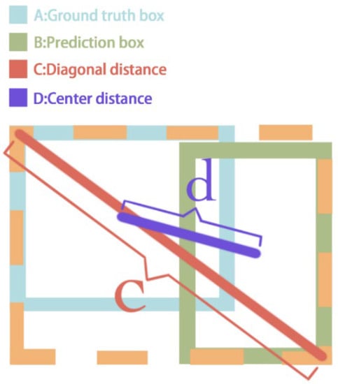 But the GIoU Loss still has some issues in certain situations. For example, when two bounding boxes are very close or overlap significantly, the IoU tends to approach 1, but they may not be well-aligned spatially. In such cases, GIoU can be highly misleading and lead to a decrease in detection performance. Therefore, when replacing the GIoU Loss function with the DIoU Loss function, as shown in Figure 8, the problem of GIoU producing larger loss values when the distance between two boxes is large and results in a larger enclosing region is solved. This leads to faster convergence []. The calculation formula for GIoU Loss is as follows: