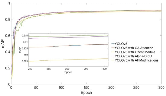 As shown in Figure 15 and Table 5, the fourth model had the best localization accuracy. This validates the improvement in accuracy and robustness achieved by the Alpha-DIoU loss function, resulting in a 7.14% improvement in localization accuracy.