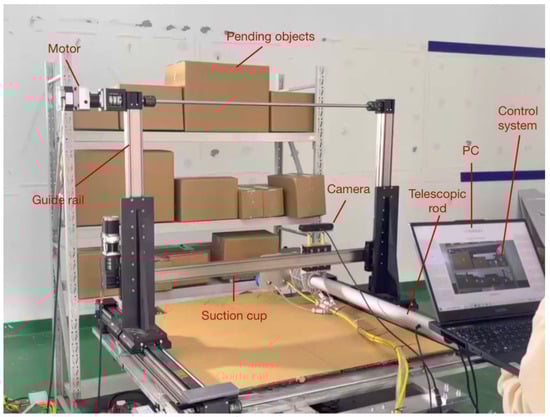 To evaluate the effectiveness of the designed system, an experimental platform was set up. The host machine’s CPU is AMD Ryzen 7 5800H, GPU is NVIDIA GeForce RTX 3060, with 16.0 GB of RAM and 6.0 GB of video memory. The camera is ZED 2i with a polarizer and a lens focal length of 4 mm. The operating system is Windows 10, CUDA 11.6.134 is installed, and the development language is Python 3.9. The calculations are performed using the PyTorch framework. The experimental setup is shown in Figure 10. The experimental system includes a PC, control system, camera, motor, slider, suction cup, telescopic rod, and target cartons for picking. In addition, the camera is mounted above the parallel middle rail and positioned at the center to ensure the widest field of view.