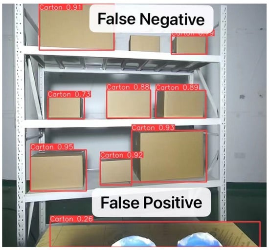 As shown in Figure 11, false positives refer to incorrectly identifying other objects as detection targets, while false negatives refer to the failure to successfully identify the cardboard boxes. Detection was performed on 200 images, comprising a total of 1824 instances. The false positive and false negative quantities were calculated.