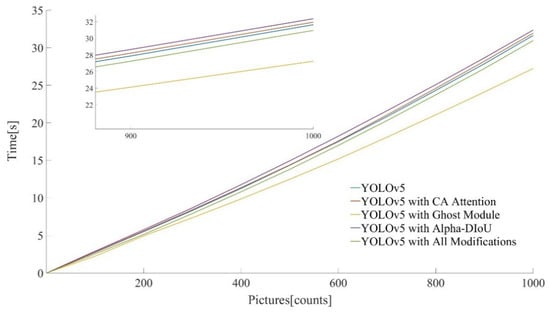 The results are shown in Figure 13 and Table 4, where the third model had the shortest response time for image processing. It can be seen that Ghost lightweightization effectively improves the detection speed, reducing the response time by 13.89%.