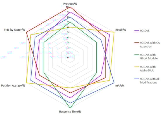 As shown in Figure 16 and Table 6, the overall highest score was obtained by using all the improved models, with a score of 51. The algorithm reduced the response time by 2.16%, improved the localization accuracy by 4.67%, and only experienced a slight decrease of 0.3% in fidelity rate. Overall, it achieved the best comprehensive performance.