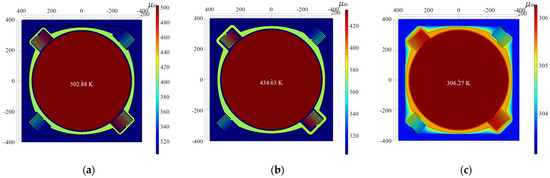 Heat distribution on the surface of the mirrors: (a) Surface temperature of micromirror No. 1 without oxide layer; (b) Surface temperature of micromirror No. 2 without oxide layer; (c) Surface temperature of micromirror No. 1 with 1000 nm silicon oxide layer.