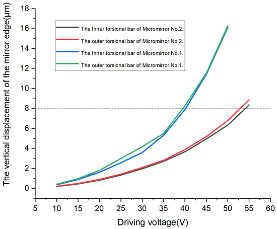 Additionally, we conducted a simulation analysis of the mechanical performance of the micromirrors using the solid mechanics module and electrostatic module in the finite element software. When excitation is applied to the bottom electrodes, the mirror surface of the micromirror undergoes motion due to electrostatic attraction. Taking a point at the edge of the micromirror, the mechanical rotation of the micromirror is characterized by its displacement component perpendicular to the bottom electrode. From Figure 4, the observed results reveal that micromirror No. 2 achieves an 8-micrometer displacement with an approximate voltage of 53 V, whereas micromirror No. 1 accomplishes the same displacement with only around 40 V. This demonstrates that increasing the length of the torsional bars and reducing its width can indeed decrease the torsional stiffness coefficient of the torsional bars, thereby reducing the driving voltage required.